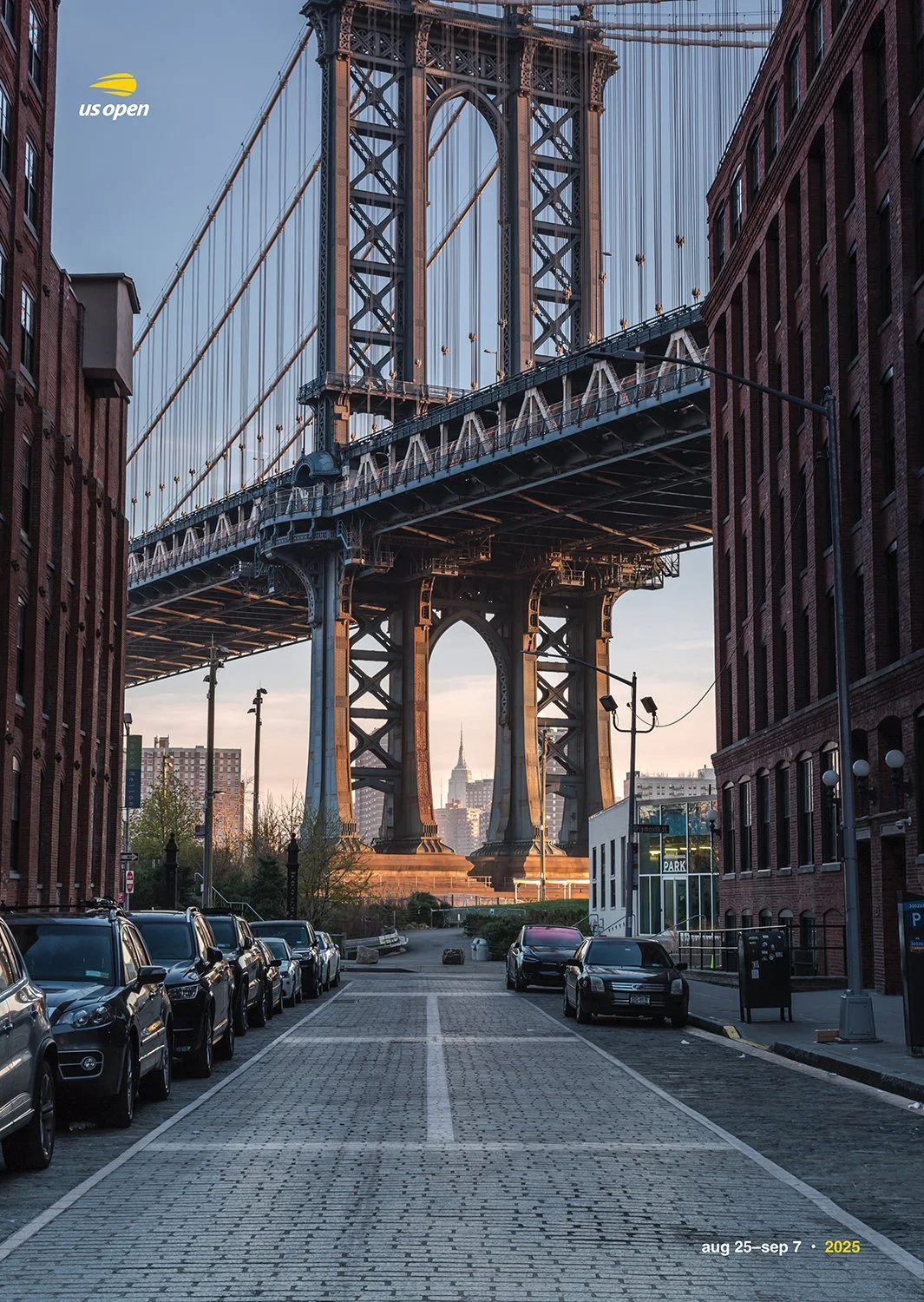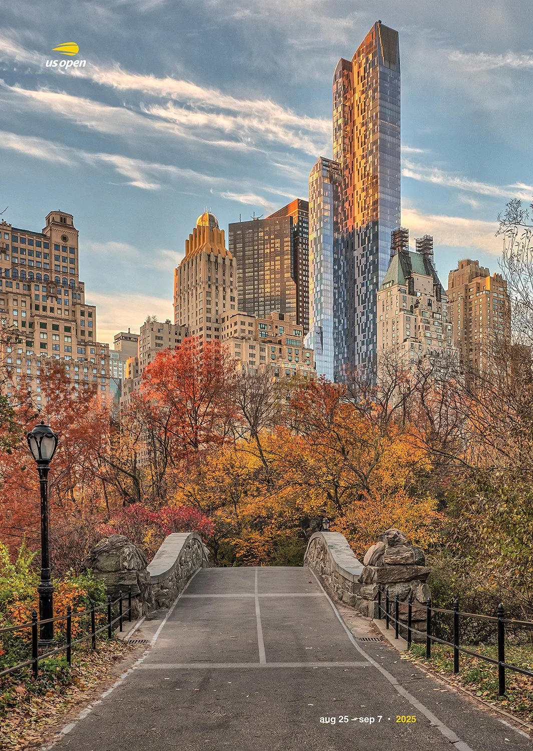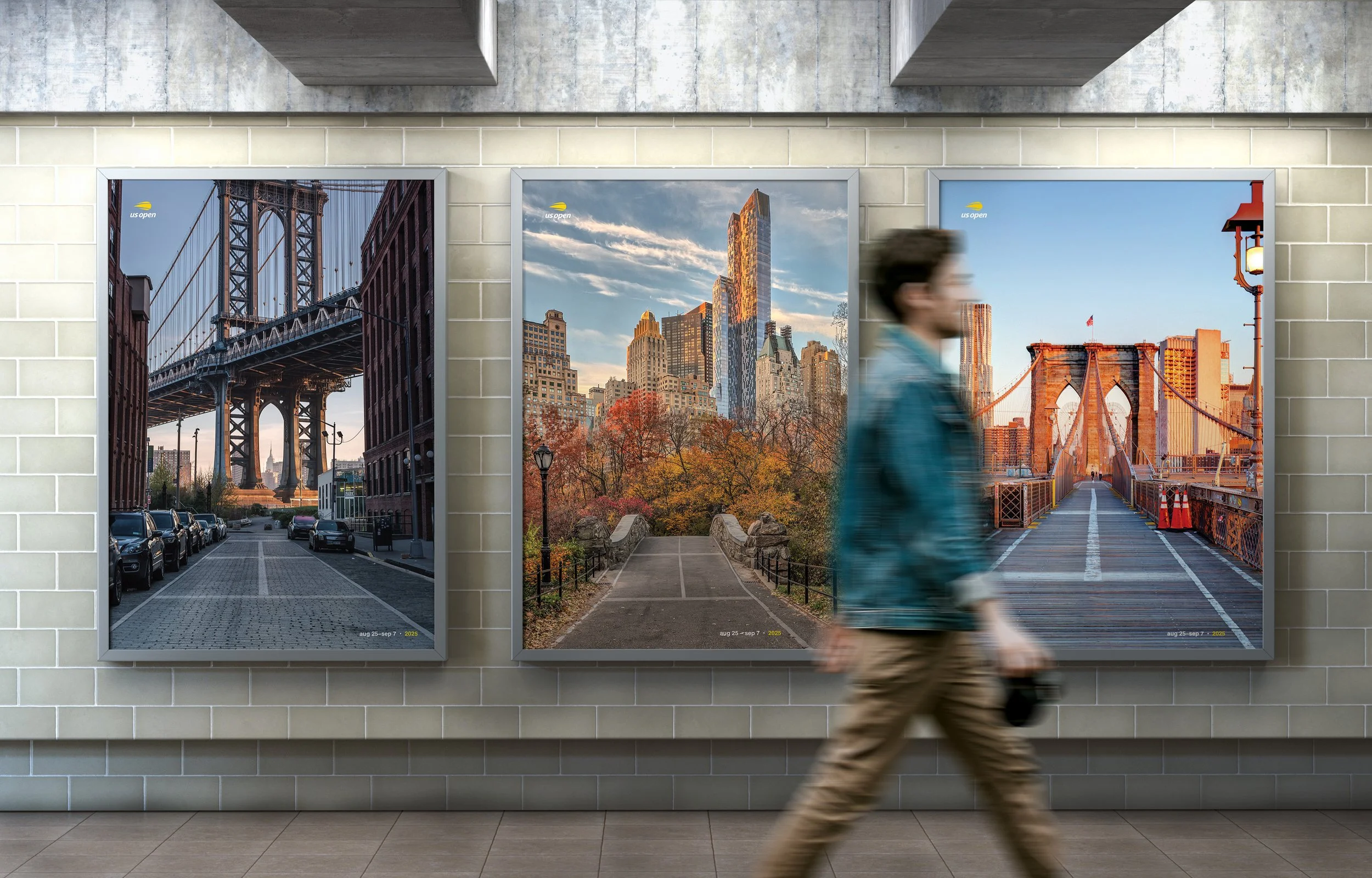 To communicate this idea, I used photographs of recognizable locations around New York City and integrated the white lines of a tennis court into the streets and pathways within the images. This creates the illusion that the city itself becomes a tennis court, reinforcing the presence of the tournament throughout the environment. I used a combination of AI-generated elements and hand-created line work to build the court markings while keeping the designs clean and visually integrated with the photographs.