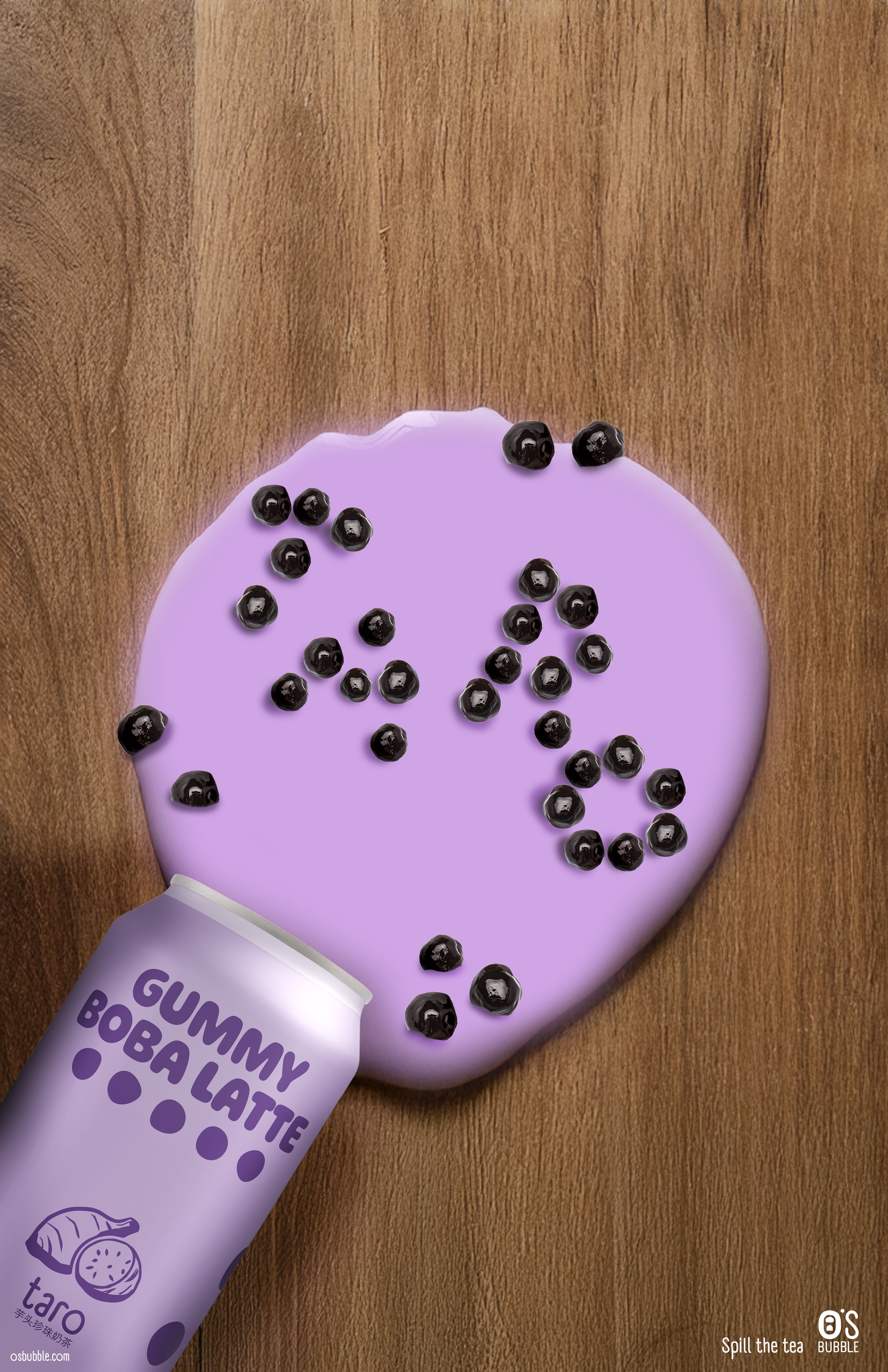 I redesigned the Taro flavor using a playful purple palette and bubble‑inspired type. The logo features a can‑tab integrated into the “O” for a more product‑driven identity. For the advertisement, I created a visual pun: the drink spills into tapioca pearls that spell “taro,” a concept that can extend across future flavors.