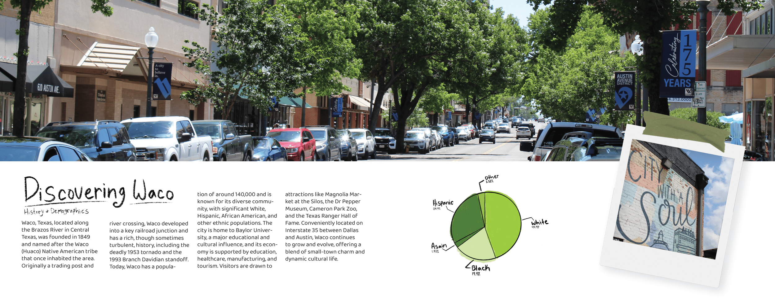The challenge for this project was to design a travel booklet highlighting places to visit in Waco. The project required conducting research, writing the content, photographing locations, and designing the entire booklet. The goal was to create an engaging publication that encourages readers to explore the city.