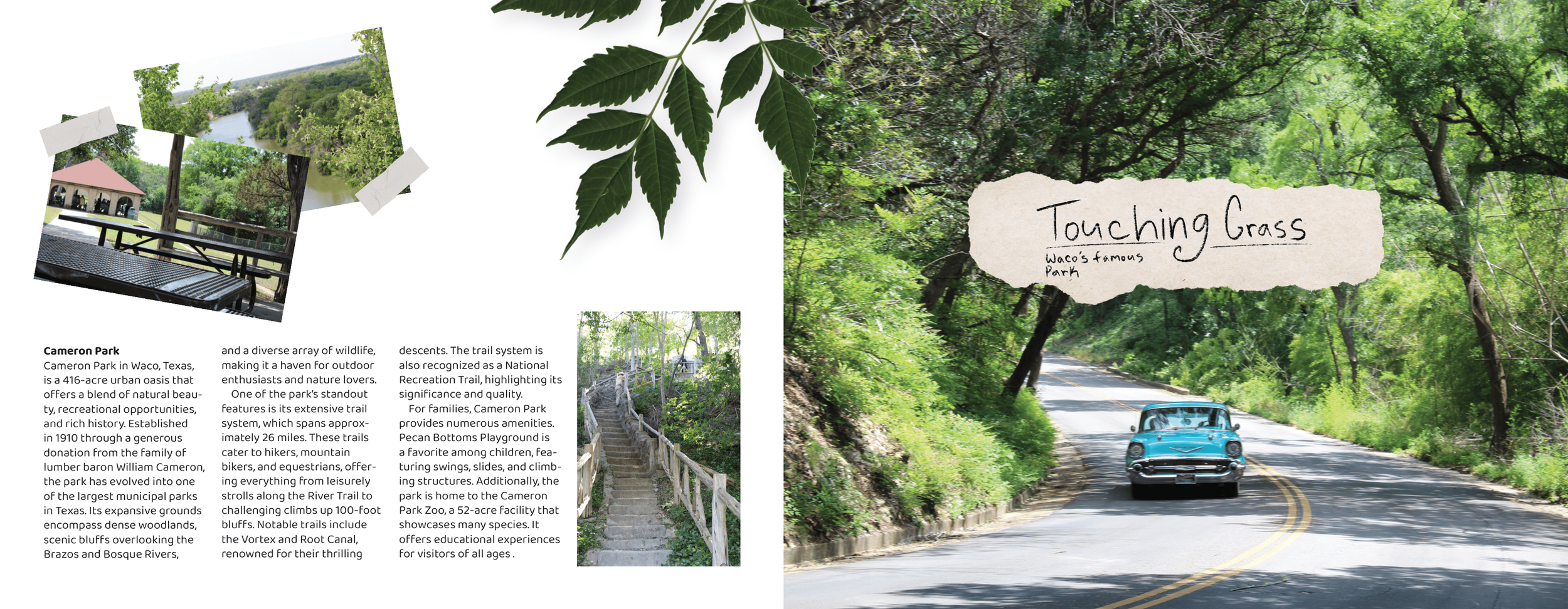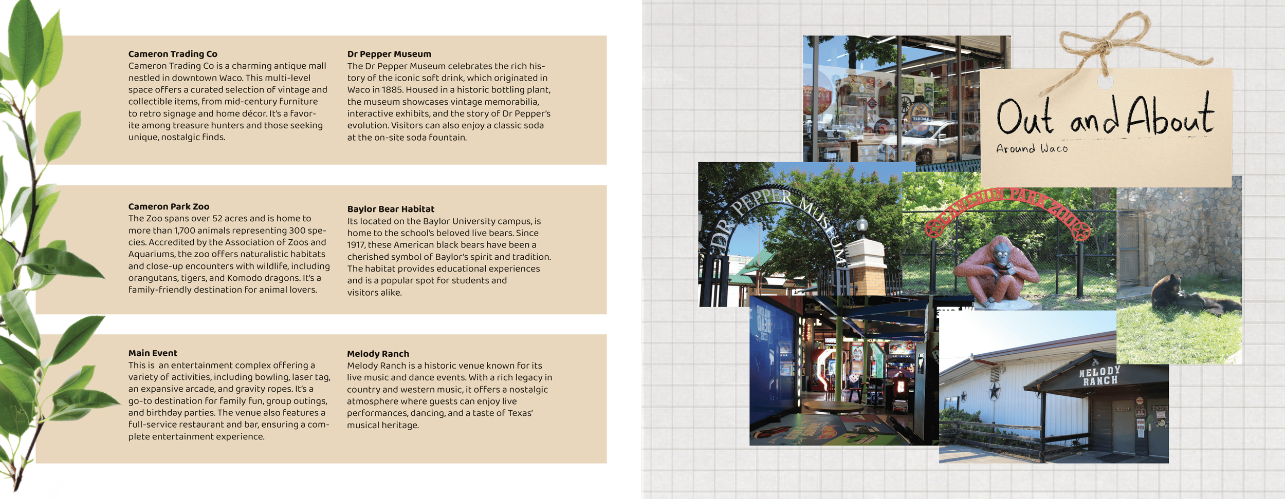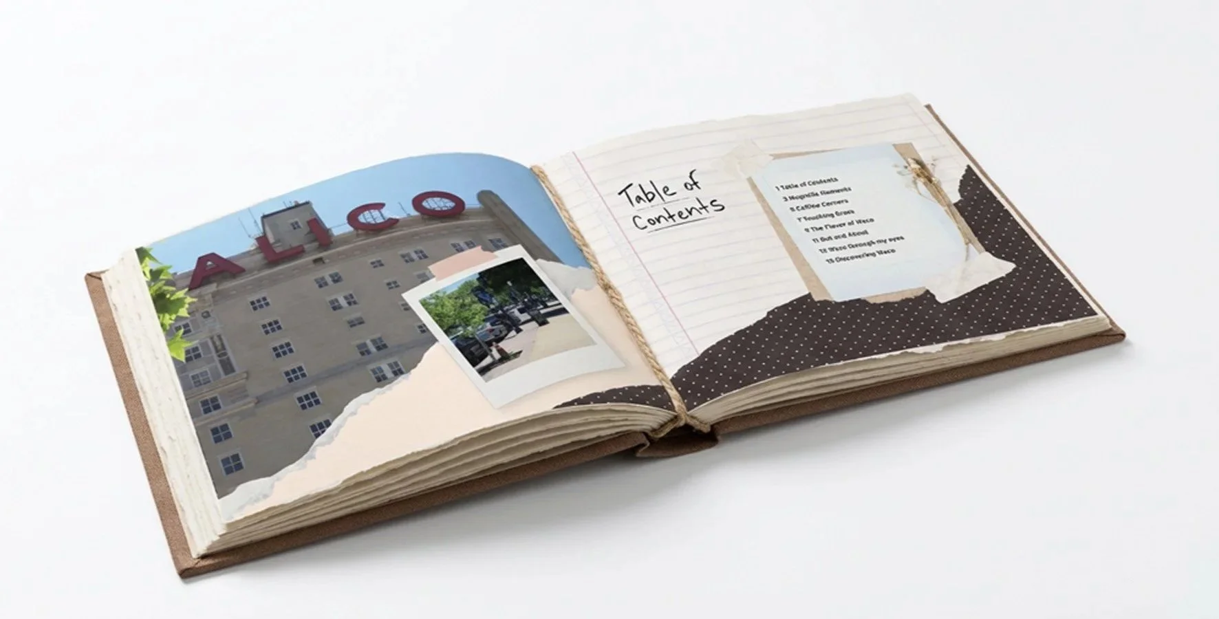 For this project, I approached the booklet as if it were a scrapbook documenting adventures around Waco. I took all of the photographs myself while visiting locations around the city and designed the spreads to feel personal and collected. Inspired by the adventure book from the movie Up, I created a string-bound scrapbook style with paper tears, layered textures, and scanned elements that I gathered myself. This approach helps the booklet feel like a collection of memories from exploring the city rather than a traditional travel guide. The final booklet includes eight spreads, including a table of contents, that guide readers through different experiences and destinations around Waco. All mockups for the project were created using Adobe Firefly AI.