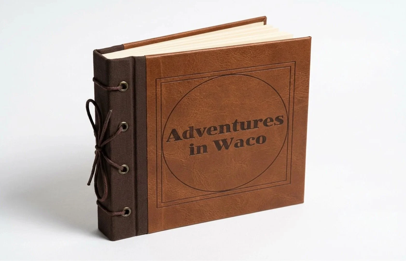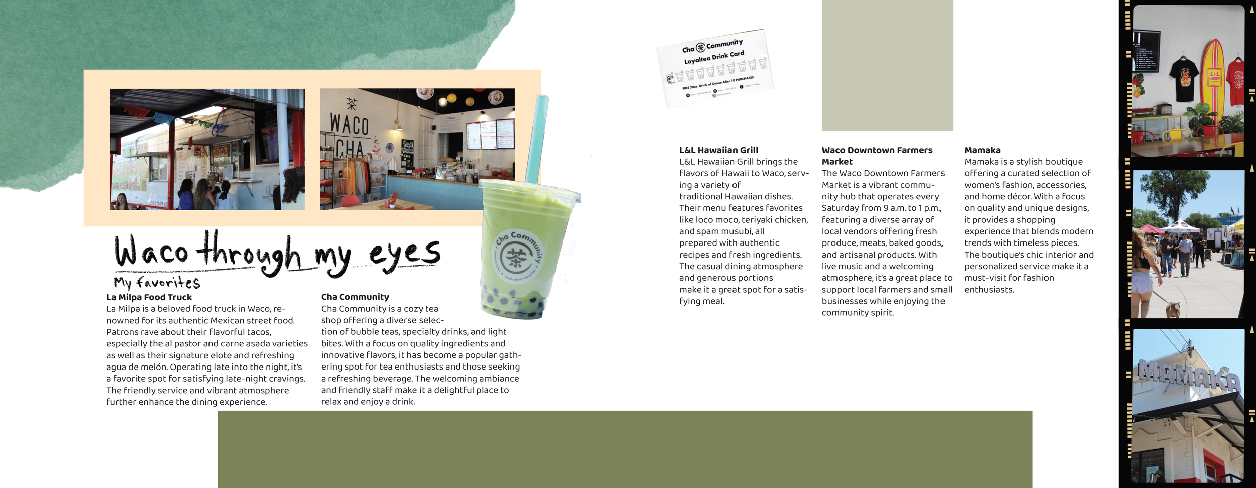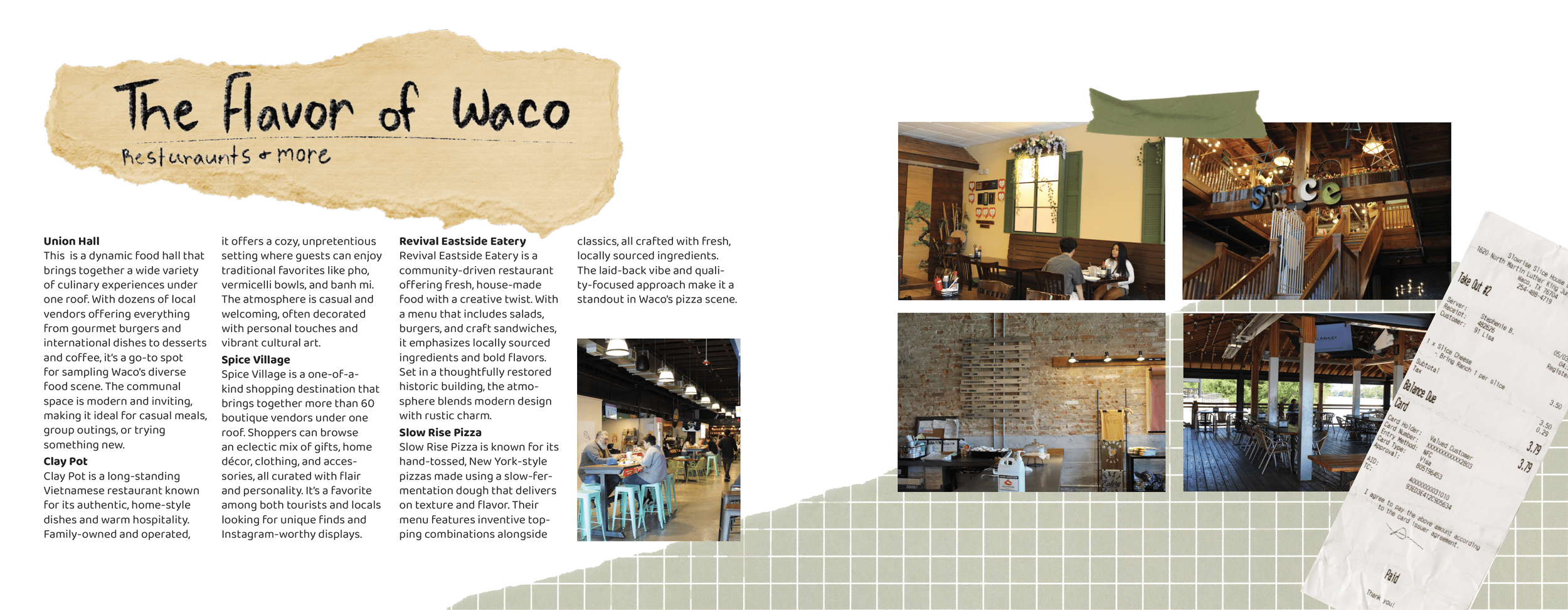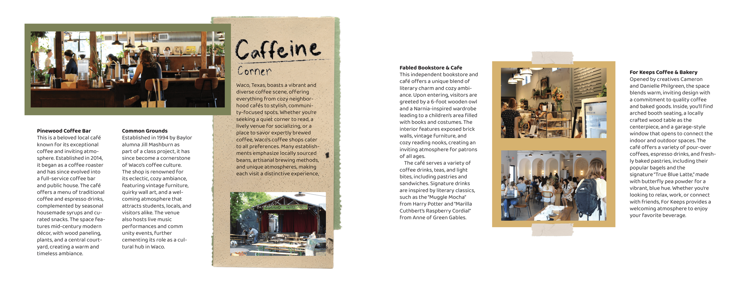For this project, I approached the booklet as if it were a scrapbook documenting adventures around Waco. I took all of the photographs myself while visiting locations around the city and designed the spreads to feel personal and collected. Inspired by the adventure book from the movie Up, I created a string-bound scrapbook style with paper tears, layered textures, and scanned elements that I gathered myself. This approach helps the booklet feel like a collection of memories from exploring the city rather than a traditional travel guide. The final booklet includes eight spreads, including a table of contents, that guide readers through different experiences and destinations around Waco. All mockups for the project were created using Adobe Firefly AI.